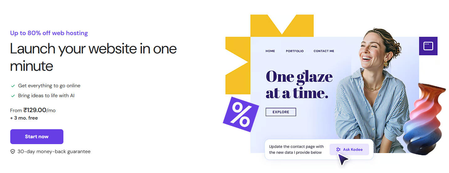 | Single Web Hosting | 1 simple site | Free SSL, 1 website, managed hPanel | ₹69–₹99/mo* |